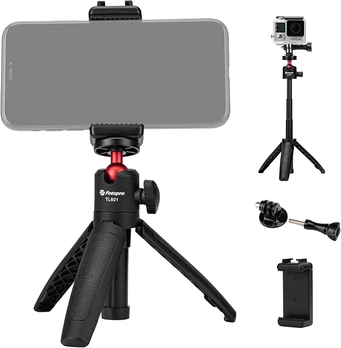 - ANTI-SLIP DESIGN: The Fotopro TL-601 tripod handle covered with leather-like embossed rubber, which is comfortable to touch and anti-slip at the same time. The legs are equipped with snap buttons that can be easily closed and fixed.